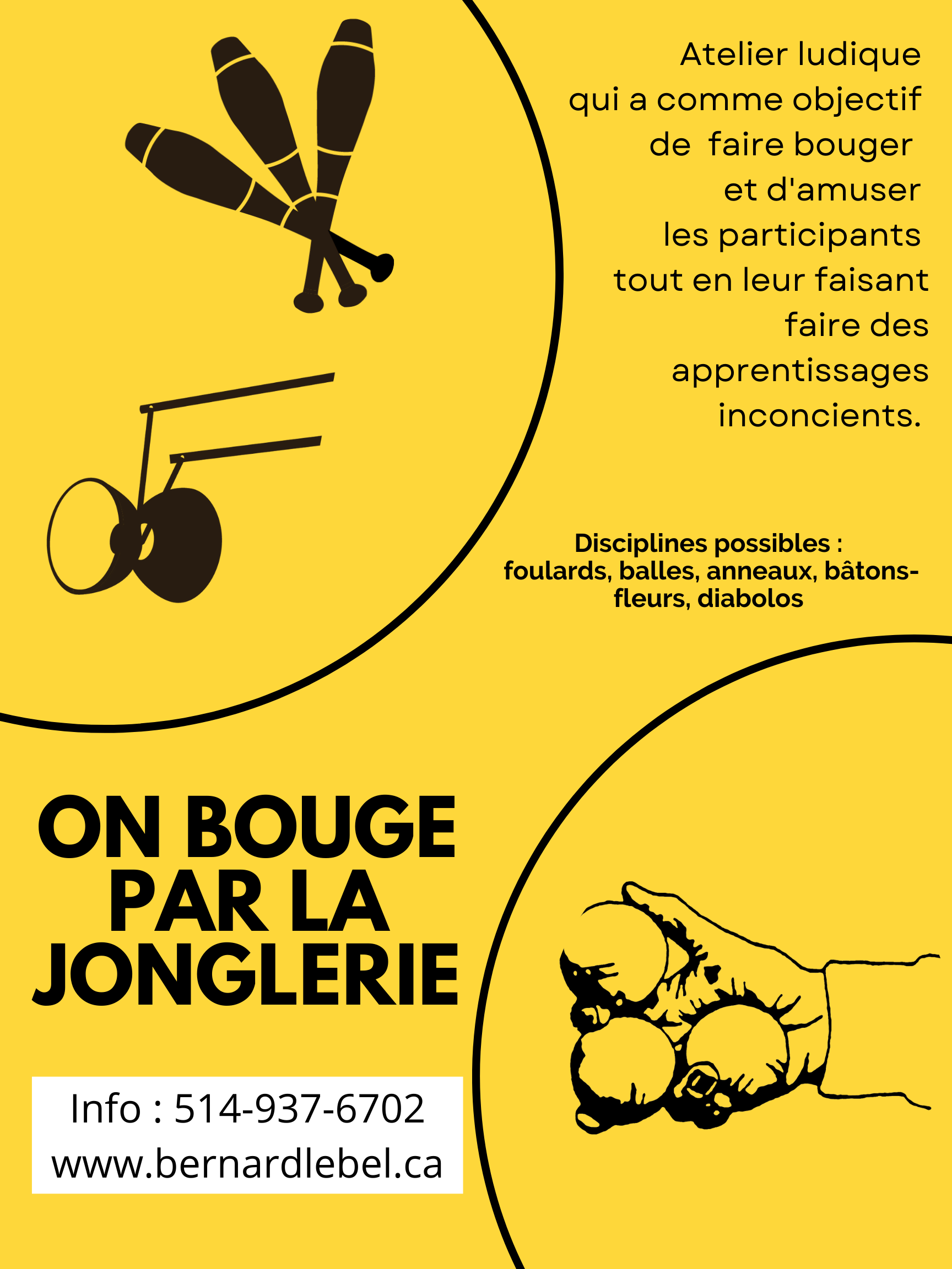 - Atelier de découverte de la jonglerie pour un groupe de résidents en CHSLD, axé sur la motricité douce et le plaisir de réussir.