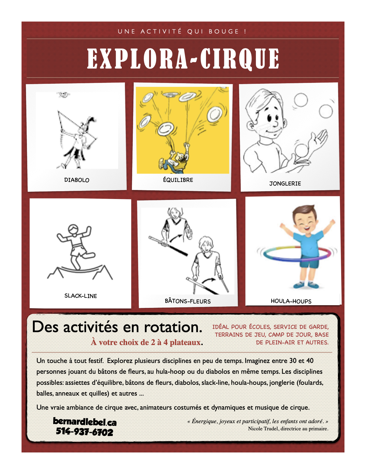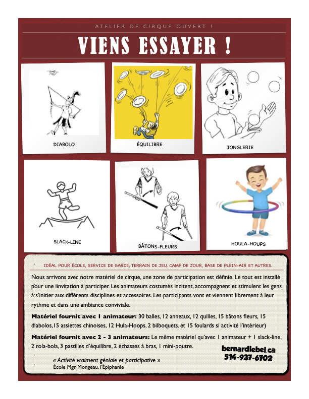 Nous vous proposons une formule d’atelier sur mesure, incluant les disciplines proposées, le déroulement, les besoins logistiques et les coûts associés. Des ajustements peuvent évidemment être ajusté en fonction de vos attentes. - Animation sur place